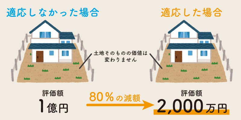 正確な計算ではありませんが、評価額1億円の土地の相続税は約3,000万円だけれど、評価額が2,000万円になると、相続税は約100万円になる、というイメージです。 相続する土地の価値は変わらないのに、大幅な節税効果が見込めることが特徴です。