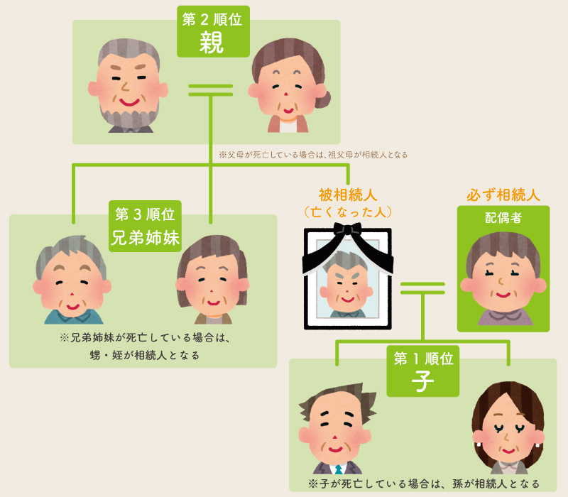 血縁関係によって相続順位(優先順位)が決まっています。